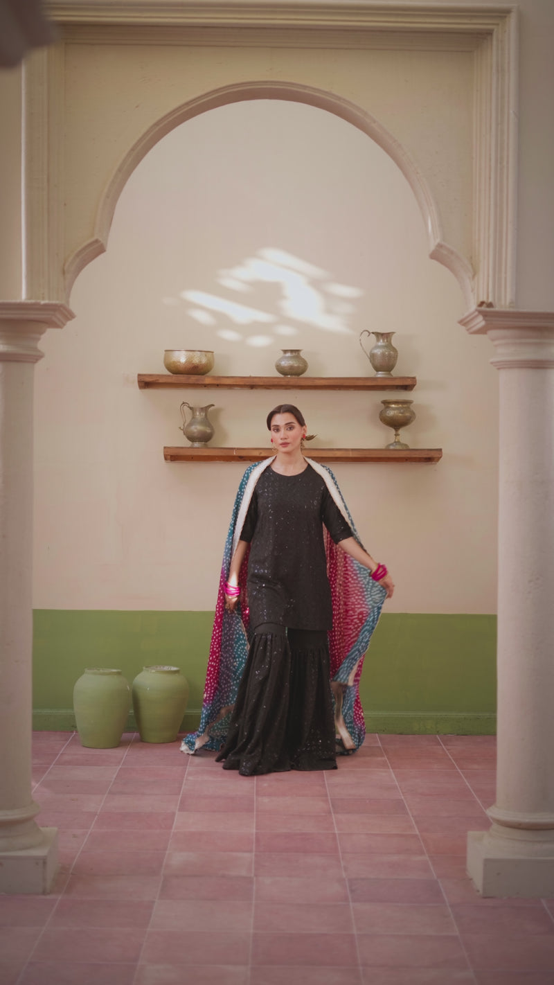 This exquisite chunri dupatta is crafted from pure silk and dyed in two harmonious hues, creating a striking yet traditional visual flow. Handcrafted gota embroidery adds a radiant touch of festivity, while delicate adda work enhances its artisanal charm. Finished with shimmering gota laces along the borders, the dupatta beautifully blends cultural richness with refined craftsmanship