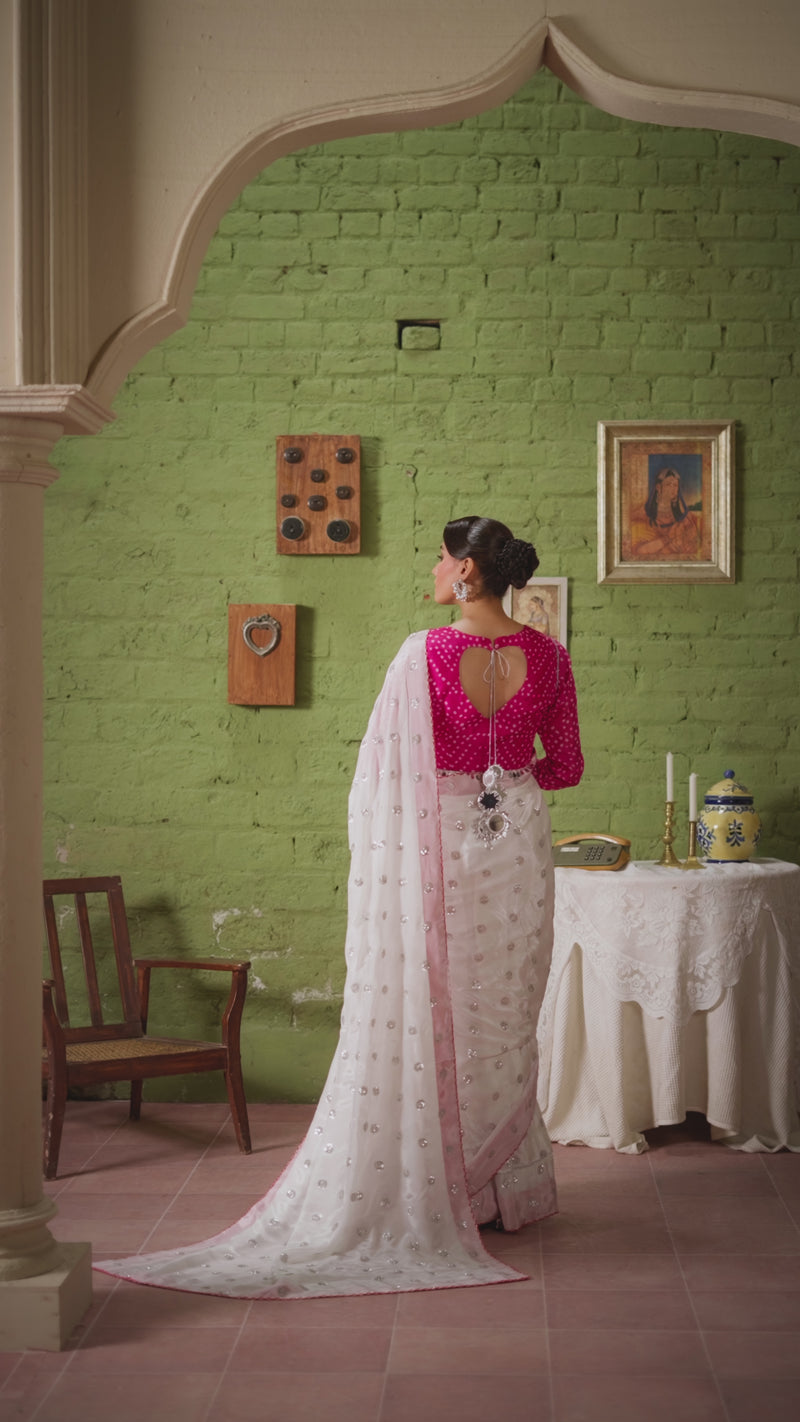 The blouse is crafted in red silk chunri fabric and a black hand embroidery, providing a vibrant focal point that complements the black saree while enhancing the overall aesthetic. The blouse color is customiseable.