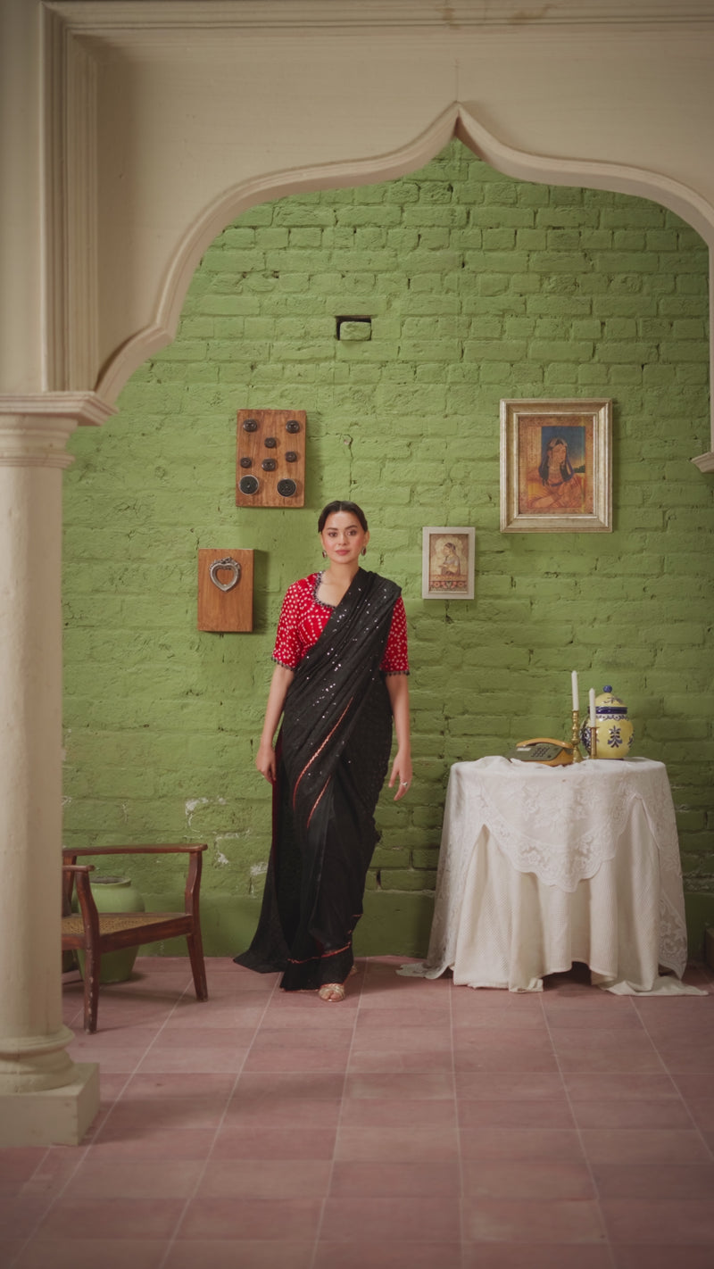 The blouse is crafted in red silk chunri fabric and a black hand embroidery, providing a vibrant focal point that complements the black saree while enhancing the overall aesthetic.the blouse color is customiseable.