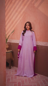 Talk To Consultant· Lilac & magenta double shirt style, crafted in pure silk, featuring delicate embellishment on buttons and color-blocked sleeves with fine stitching details.