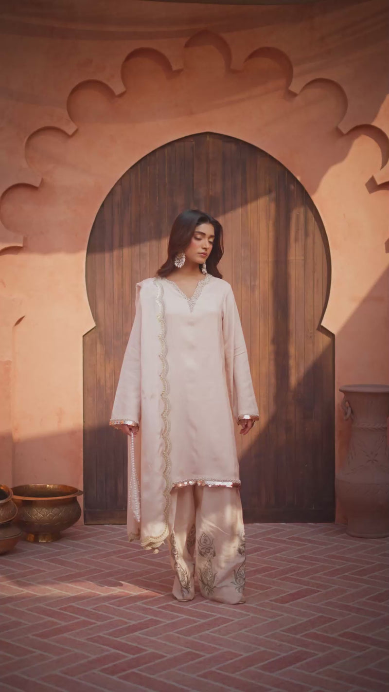Sukoon is an ode to understated Eid luxury, crafted in smooth beige silk with a graceful, relaxed silhouette. Subtle embellishments and embroidered motifs lend quiet sophistication, while the embroidered silk dupatta completes the look with timeless refinement. Effortless, serene, and beautifully balanced.