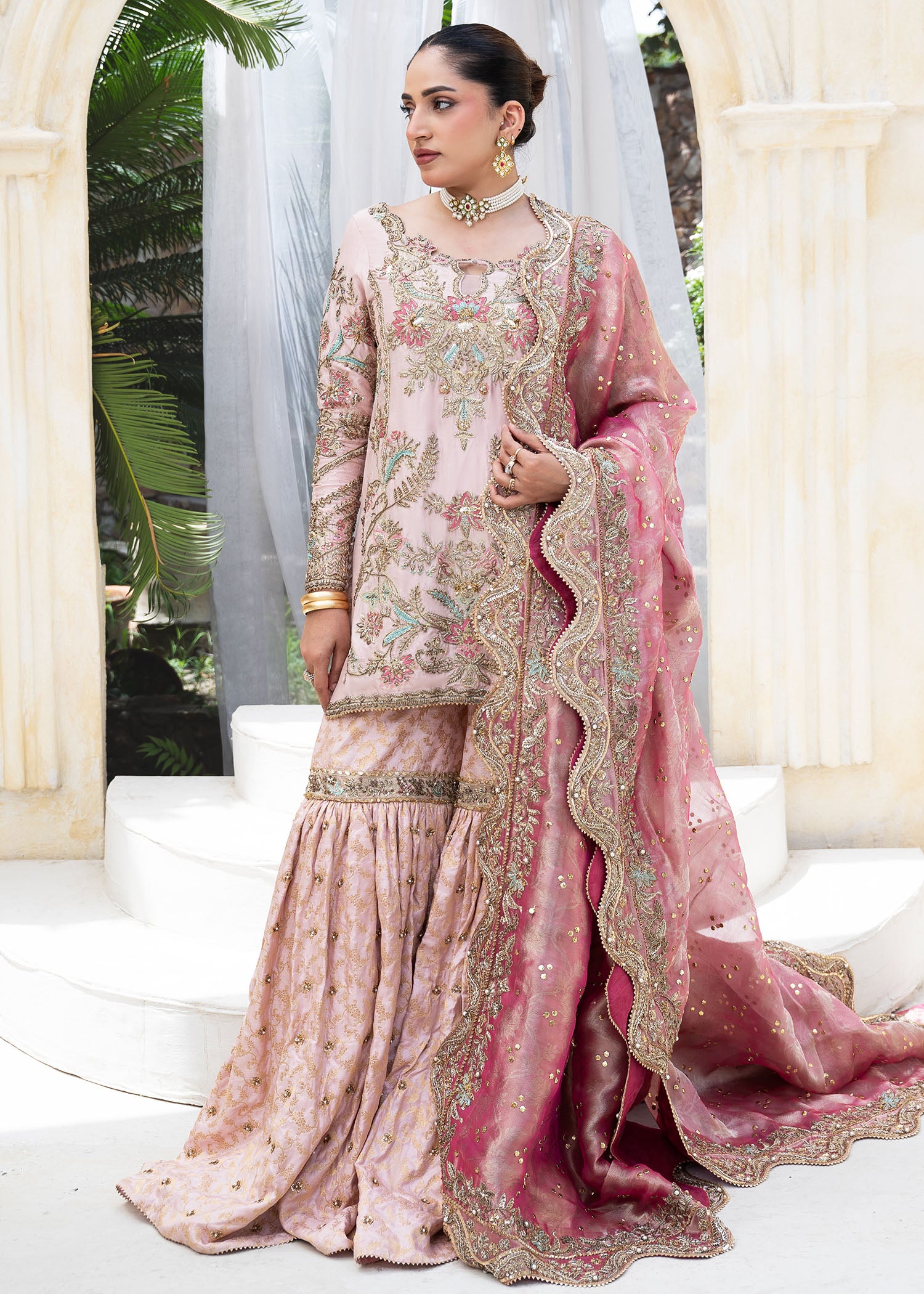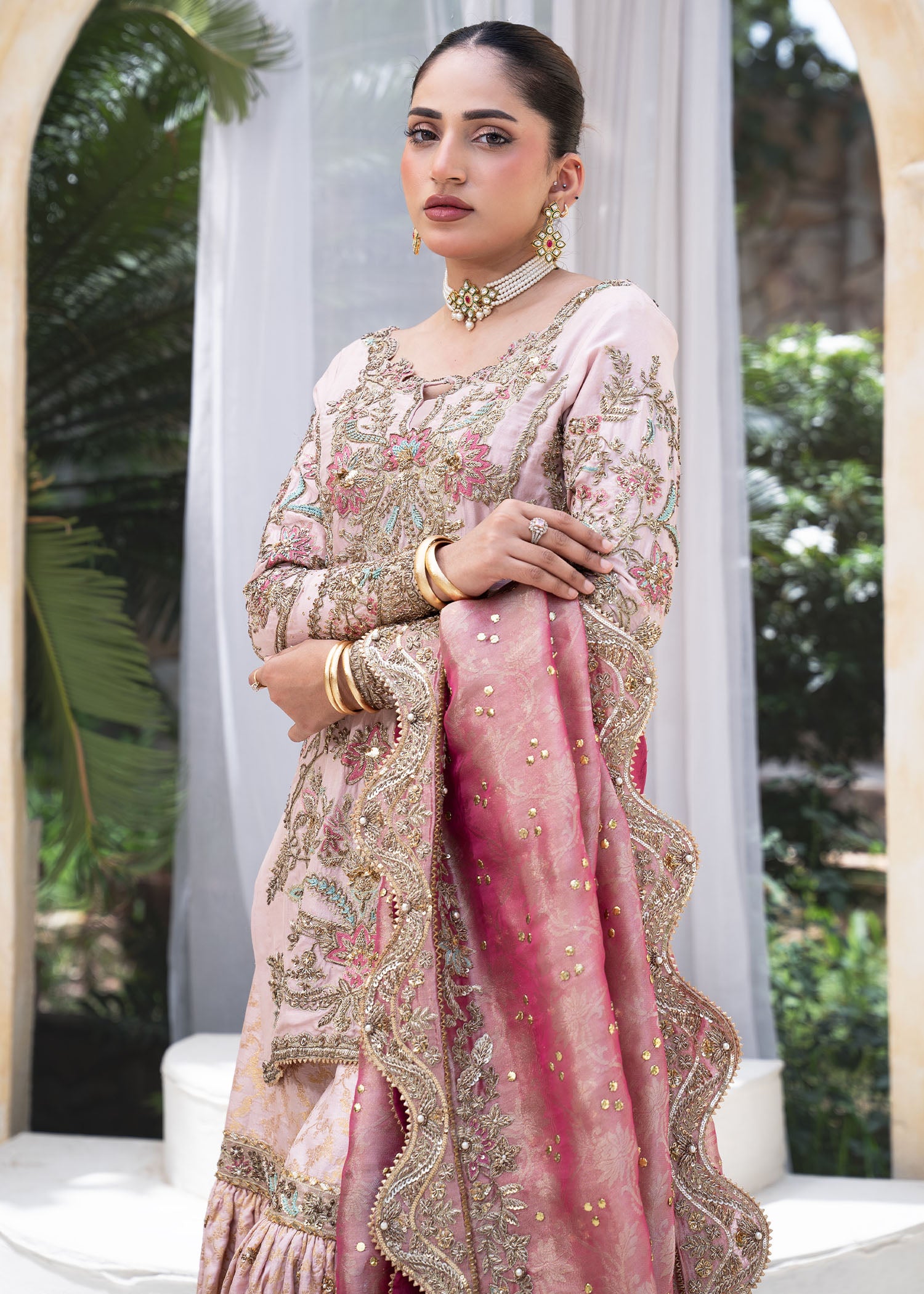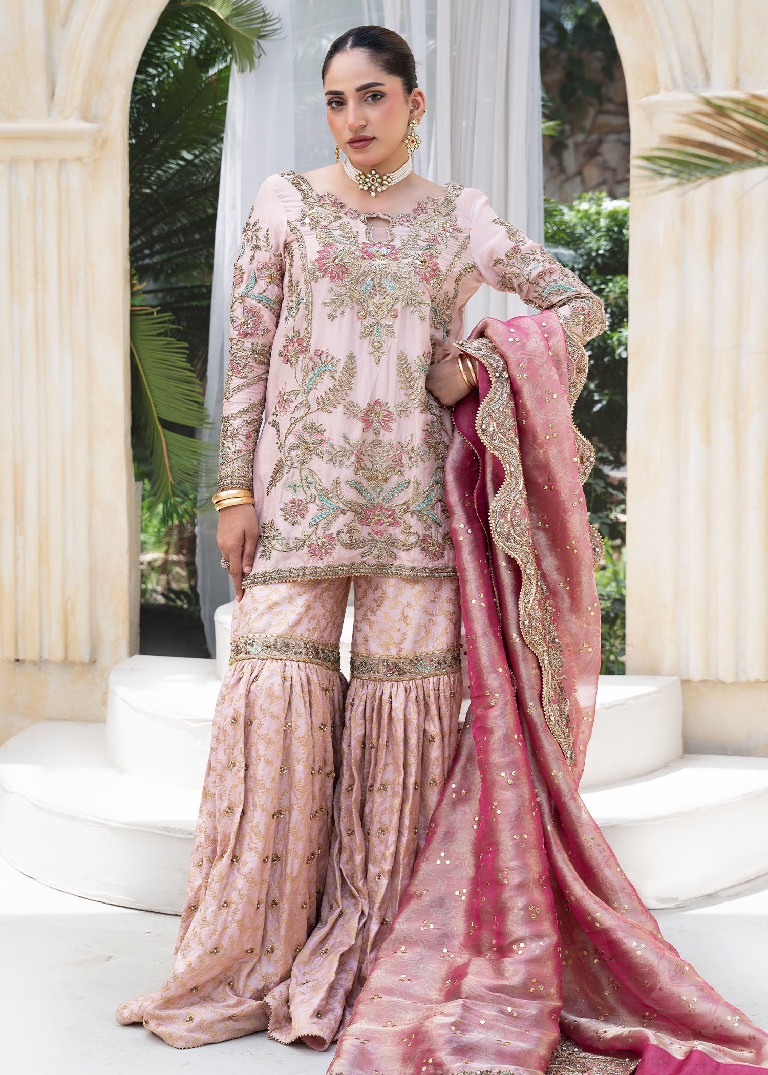 Step into timeless elegance with this stunning pink 3-piece ensemble, designed to make a lasting impression at any festive or wedding occasion. This beautifully crafted outfit features a fully embellished shirt, paired with a classic gharara that flows gracefully with every step.