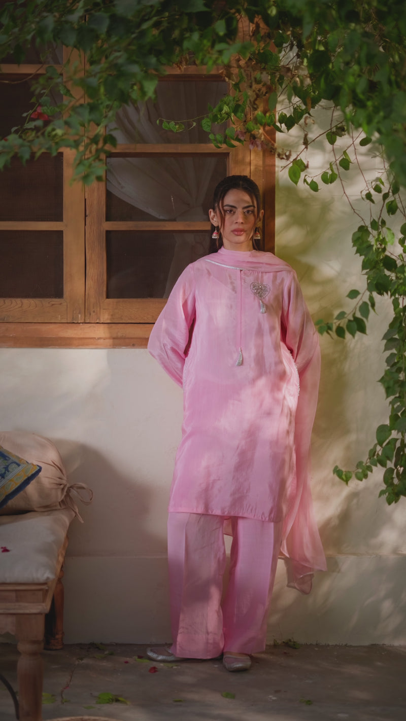 cute pink raw silk outfit, featuring traditional adda and zari embroidery. A heart-shaped motif embellishment adds a playful yet elegant accent, making it perfect for festive or casual ethnic occasions.Complete the look with the optional chiffon dupatta for a soft, flowing finish. Comfortable, stylish, and timeless, this outfit is ideal for those who love a mix of classic ethnic charm and modern cuteness