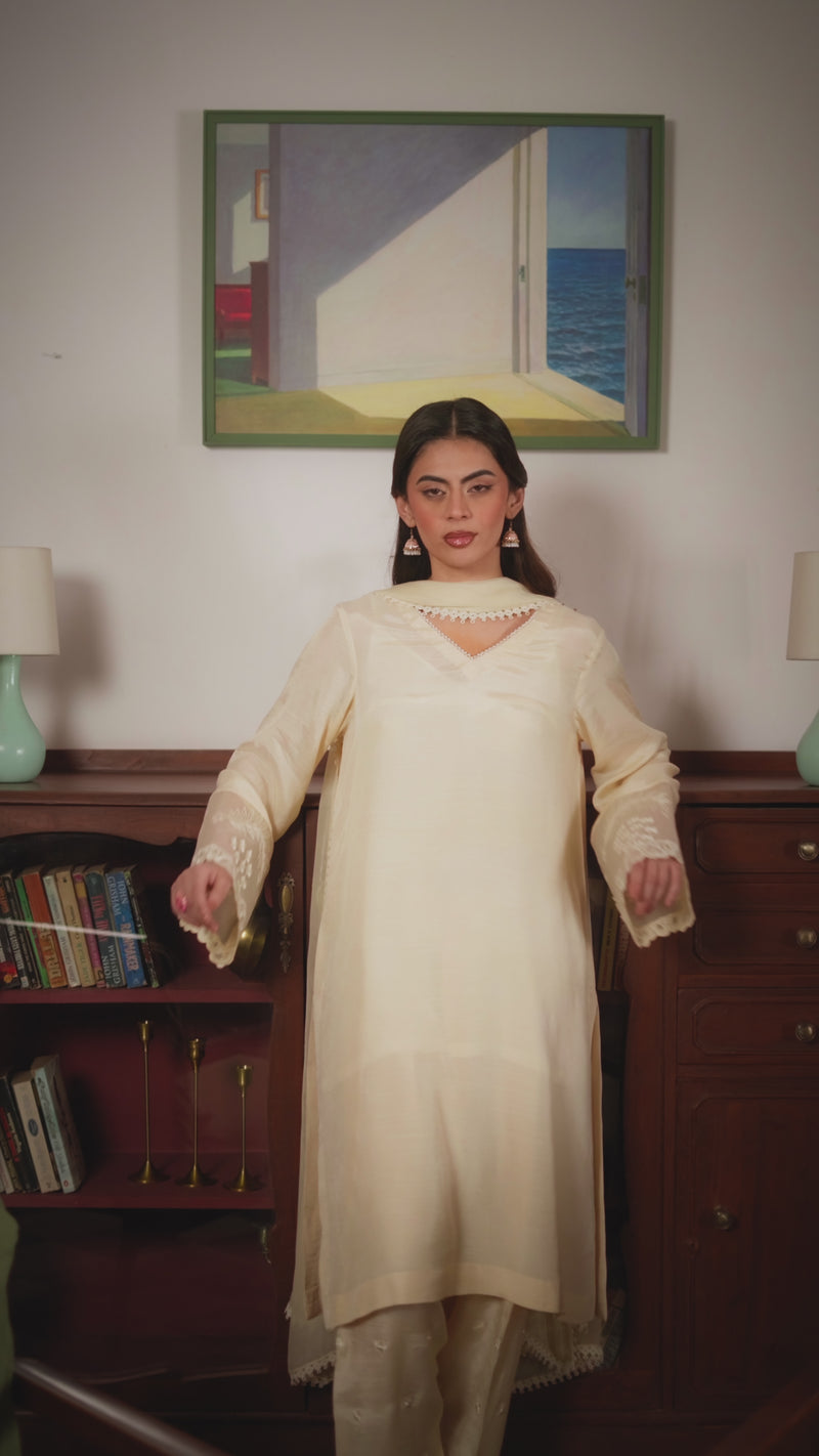 turn heads with this ivory raw silk ensemble, crafted for the modern yet tradition-loving woman. The shalwar sleeves feature intricate embroidery, soft-hued pearls, and delicate adda work, creating a luxurious, fashion-forward finishPaired with an optional chiffon dupatta, this outfit blends classic elegance with contemporary styling—perfect for festive brunches, family gatherings, or casual ethnic chic looks. The soft, flowing silhouette ensures comfort while making a subtle statement of sophistication