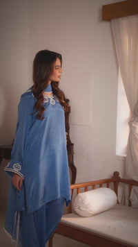 Add a touch of effortless charm with this English blue raw silk outfit, designed for everyday elegance. The neckline and sleeves feature delicate dori work embroidery, adding subtle sophistication without overwhelming the look.Pair it with the optional chiffon dupatta for a soft, flowing finish, or wear it solo for a sleek, basic-wear ensemble perfect for casual gatherings and daily ethnic styling.