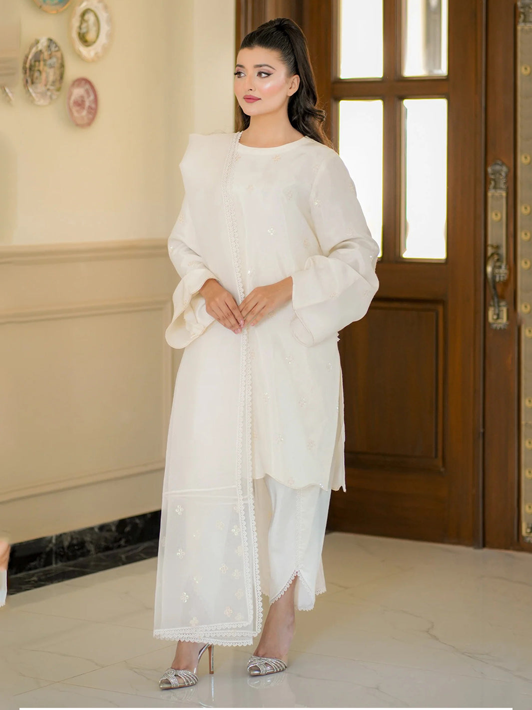 This elegant white 3-piece embroidered silk ensemble is a masterpiece of timeless grace and modern charm. The outfit features a beautifully embroidered PK silk shirt adorned with intricate designs, exuding sophistication. Paired with a stylish tulip shalwar. The lightweight, chiffon dupatta completes the ensemble, adding a touch of elegance and versatility.