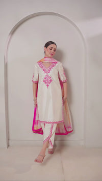 Paired with a stylish tulip shalwar, the ensemble blends classic tailoring with a contemporary silhouette. A vibrant tie & dye dupatta brings a pop of color to the look, adding contrast and artistic flair to the serene white base.