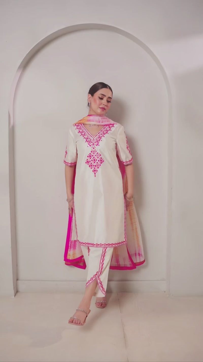 Radiate elegance with this beautifully crafted 3-piece white sheesha silk outfit, designed for refined festive wear. The embroidered shirt features intricate sheesha (mirror) work that adds a soft sparkle and traditional charm to the luxurious sheesha silk fabric. Delicate threadwork further enhances the graceful design, making it both timeless and eye-catching.