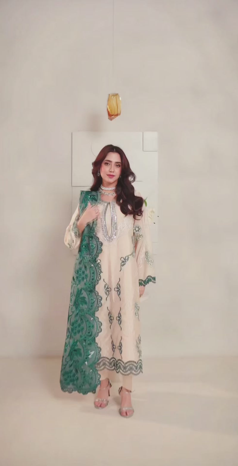 Gracefully blending elegance with statement detail, this 3-piece embellished Sheesha silk ensemble is designed to leave a lasting impression. The set features a long beige shirt crafted from lustrous Sheesha silk, adorned with delicate embellishments that add a soft shimmer and refined texture. Paired with a matching trouser, the silhouette remains sleek, flowing, and effortlessly timeless.
