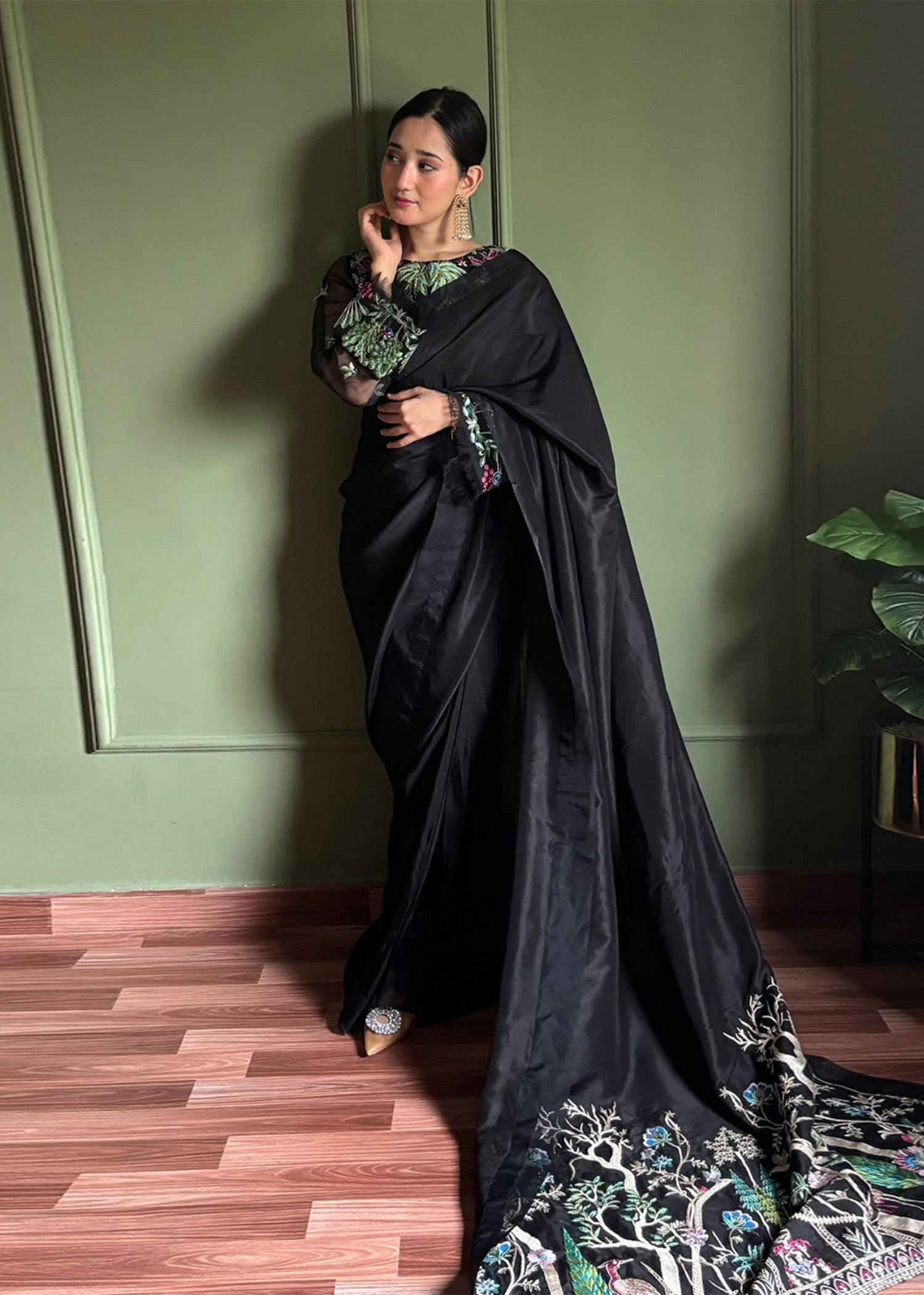 Inquire on Whatsapp This elegant ensemble features an exquisite black PK silk saree paired with a beautifully embellished blouse. The saree's luxurious black hue drapes gracefully, exuding sophistication and timeless charm. The blouse is intricately adorned with delicate embroidery, featuring shimmering beads, sequins, and intricate threadwork that catch the light with every movement. The combination of the opulent, lustrous fabric of the saree and the detailed embellishments on the blouse creates a striking contrast, elevating the entire look. Perfect for a formal evening, wedding, or any special occasion, this outfit radiates glamour, tradition, and modern elegance.