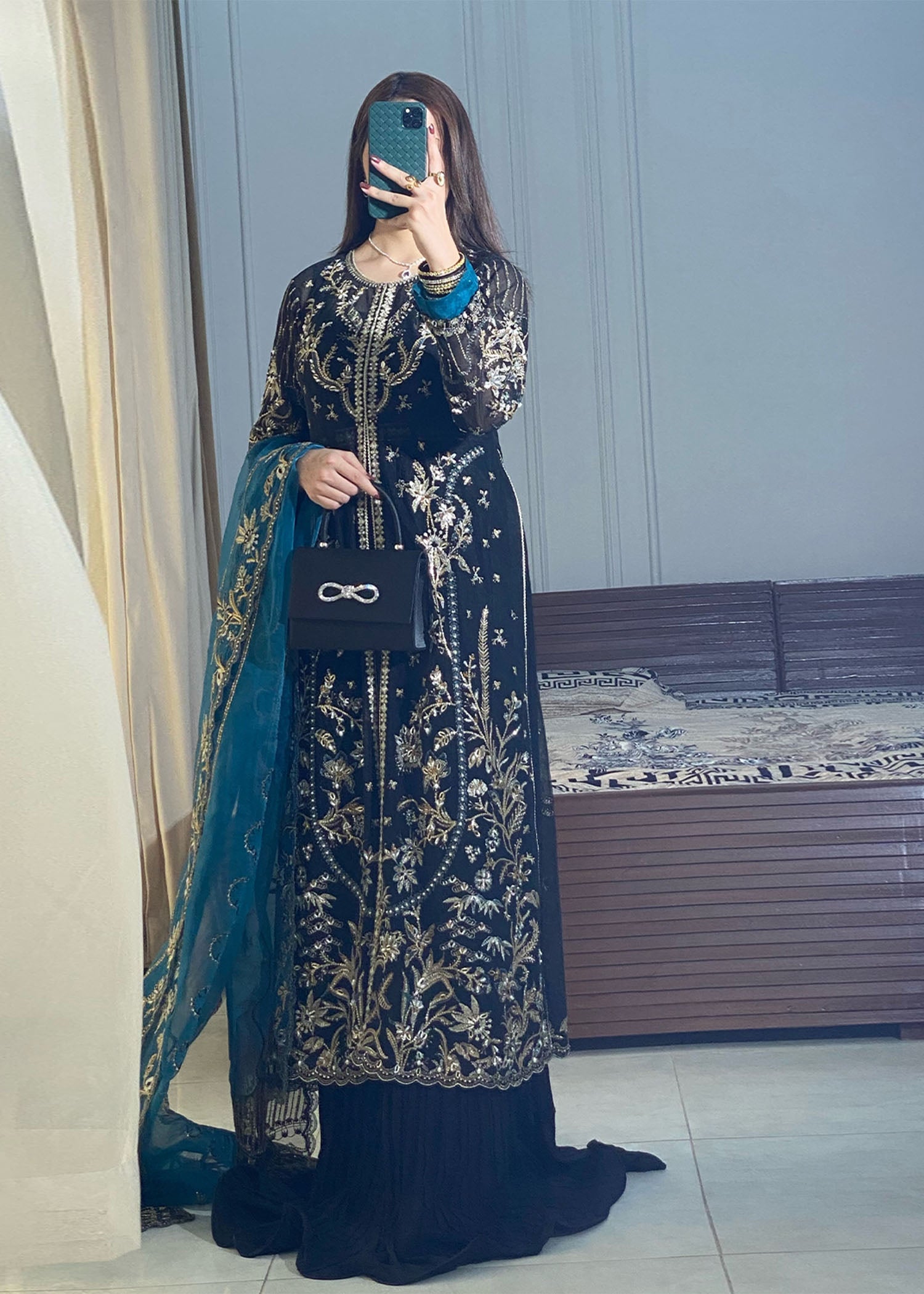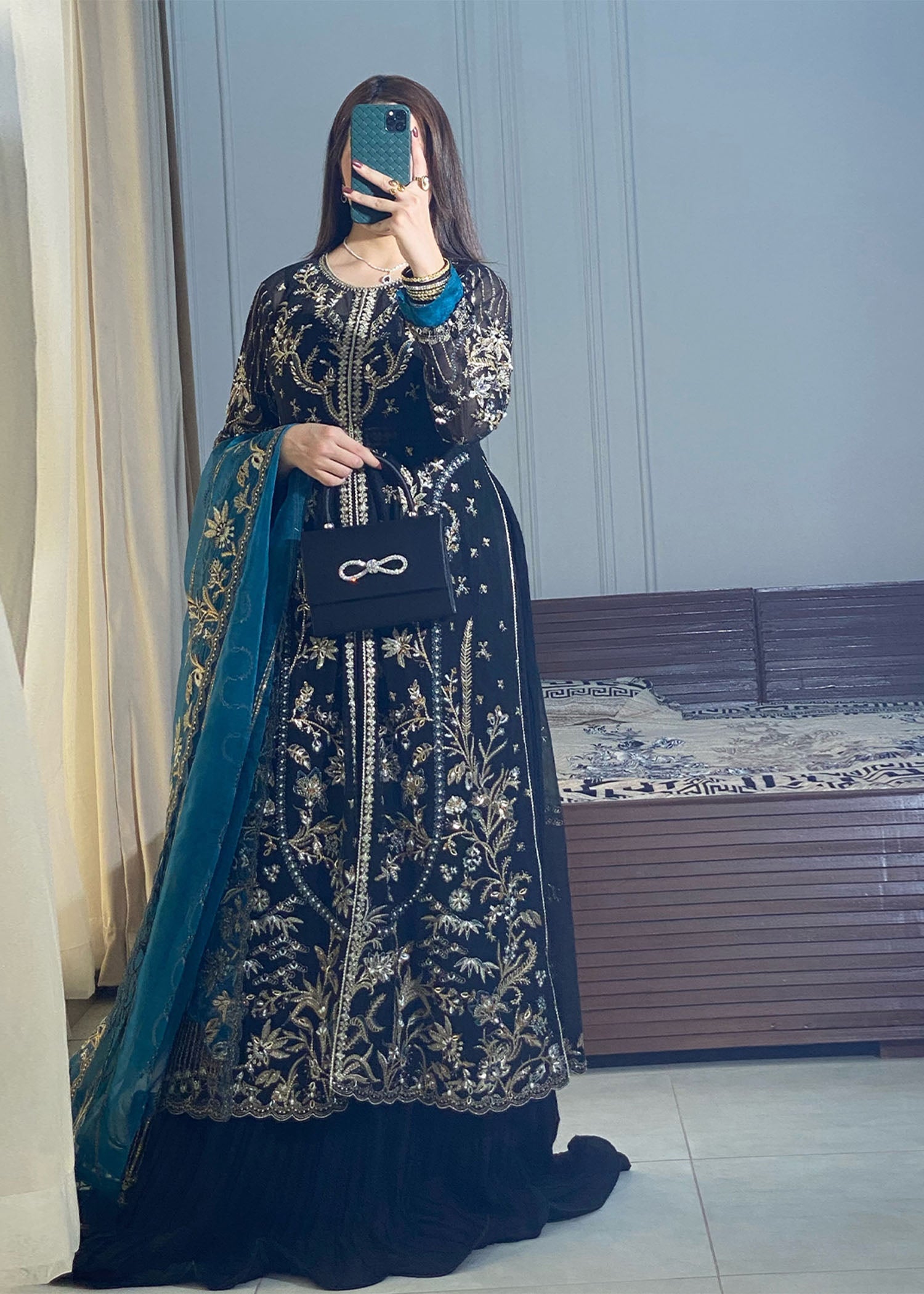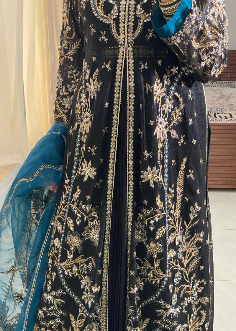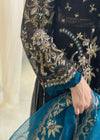 Inquire on Whatsapp Rendered in black; this exquisite ensemble is crafted with utmost precision to details. This alluring outfit features botanical embroideries accentuated with gold, silver and black hand embellishments artistically worked all over. Paired with crushed maxi and organza dupatta crafted on a surreal shade of teal blue which is framed with scalloped embroidered border. This outfit is a must have for all the soirees this season.