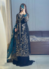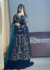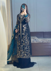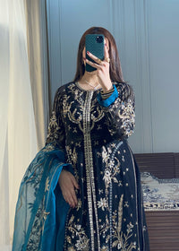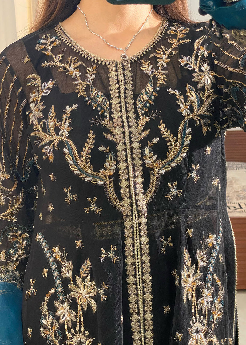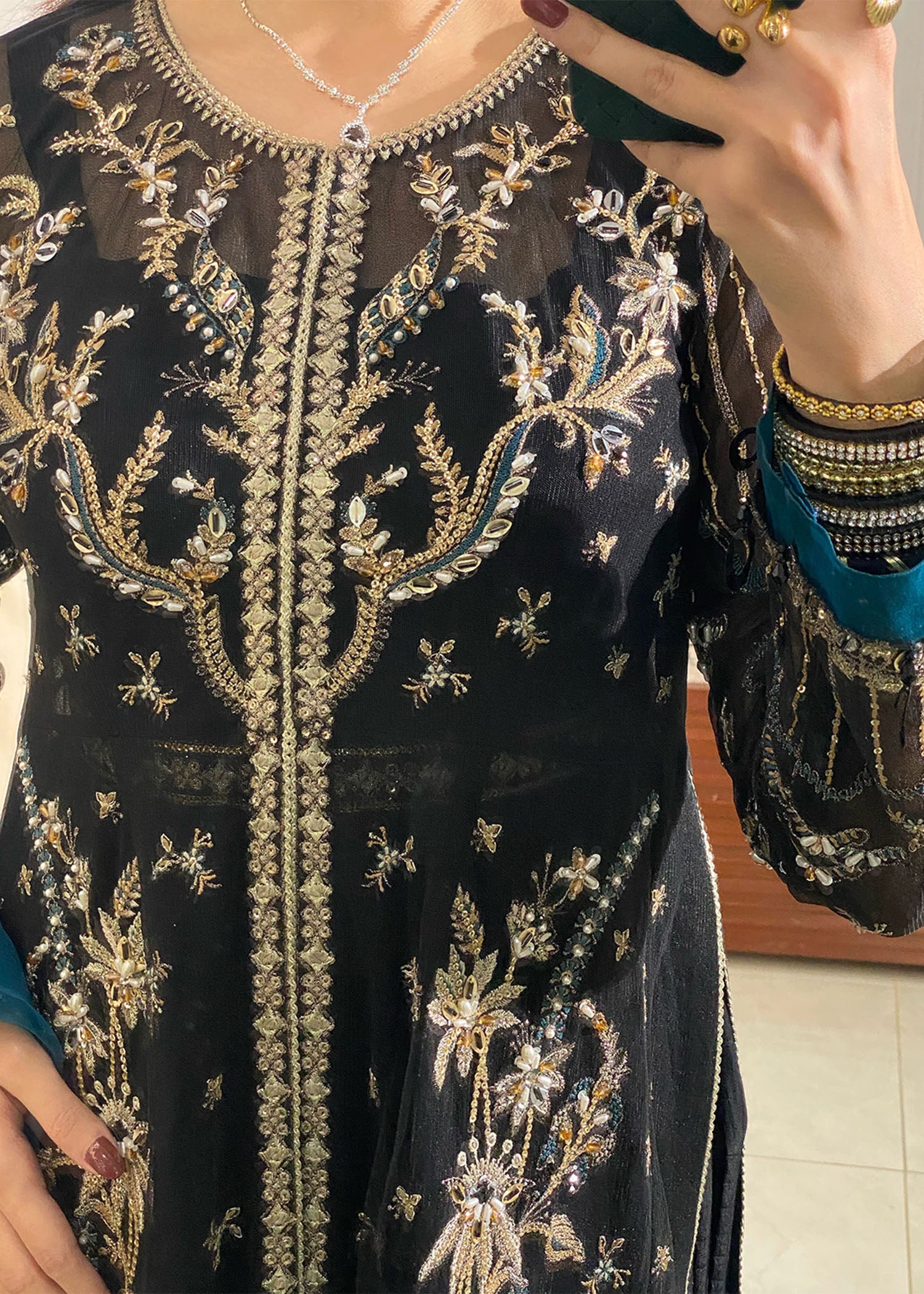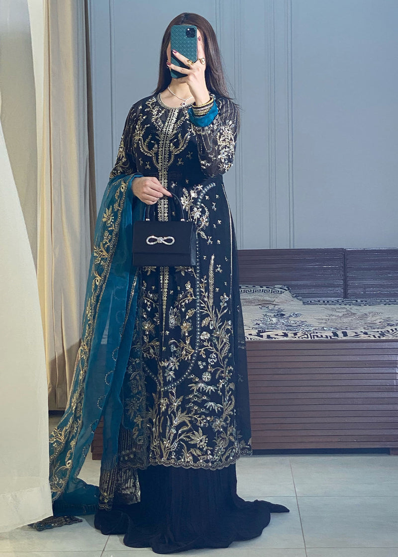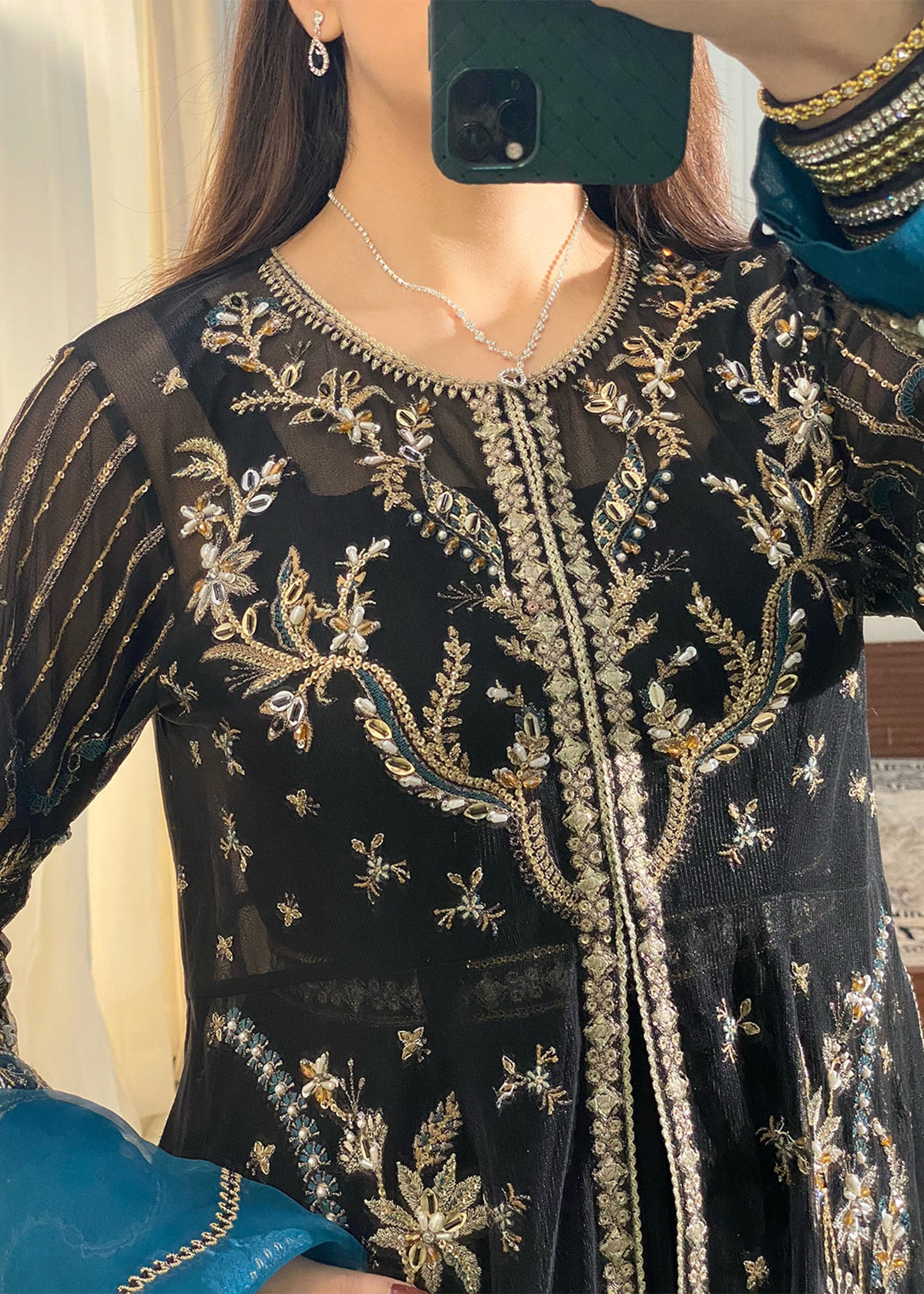 Inquire on Whatsapp Rendered in black; this exquisite ensemble is crafted with utmost precision to details. This alluring outfit features botanical embroideries accentuated with gold, silver and black hand embellishments artistically worked all over. Paired with crushed maxi and organza dupatta crafted on a surreal shade of teal blue which is framed with scalloped embroidered border. This outfit is a must have for all the soirees this season.