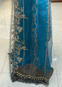 • TEAL BLUE EMBROIDERED ORGANZA DUPATTA WITH SCALLOP DETAILS.