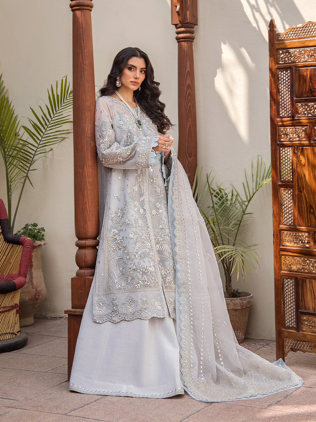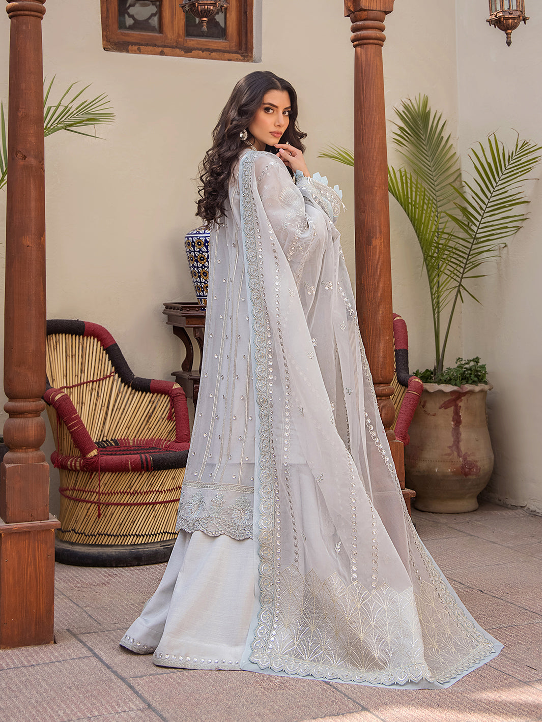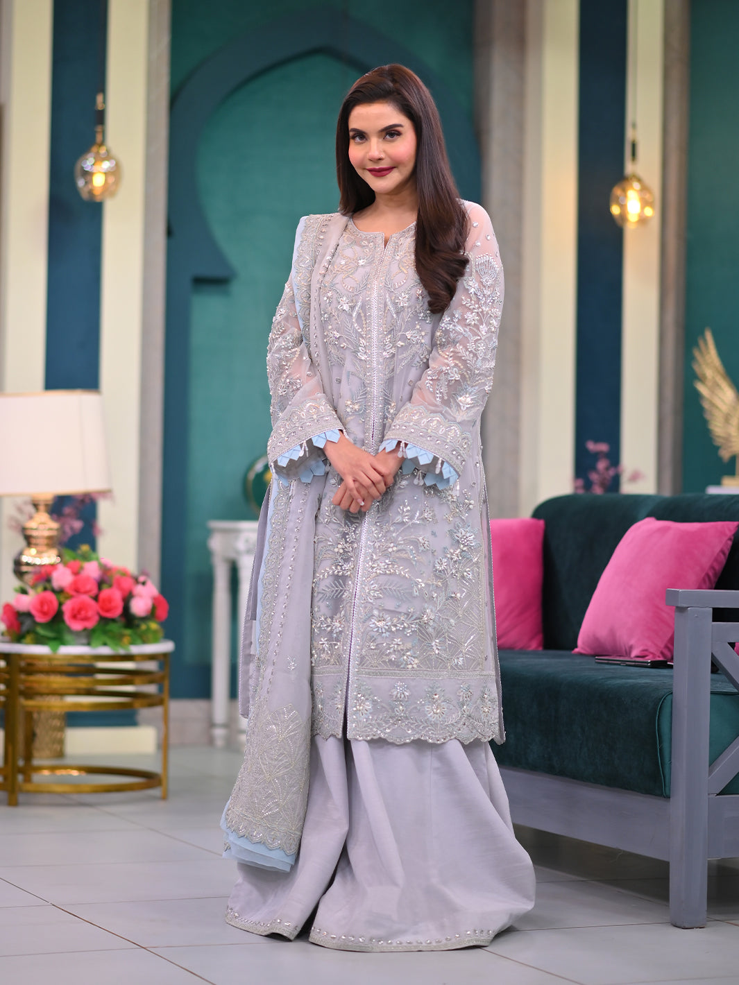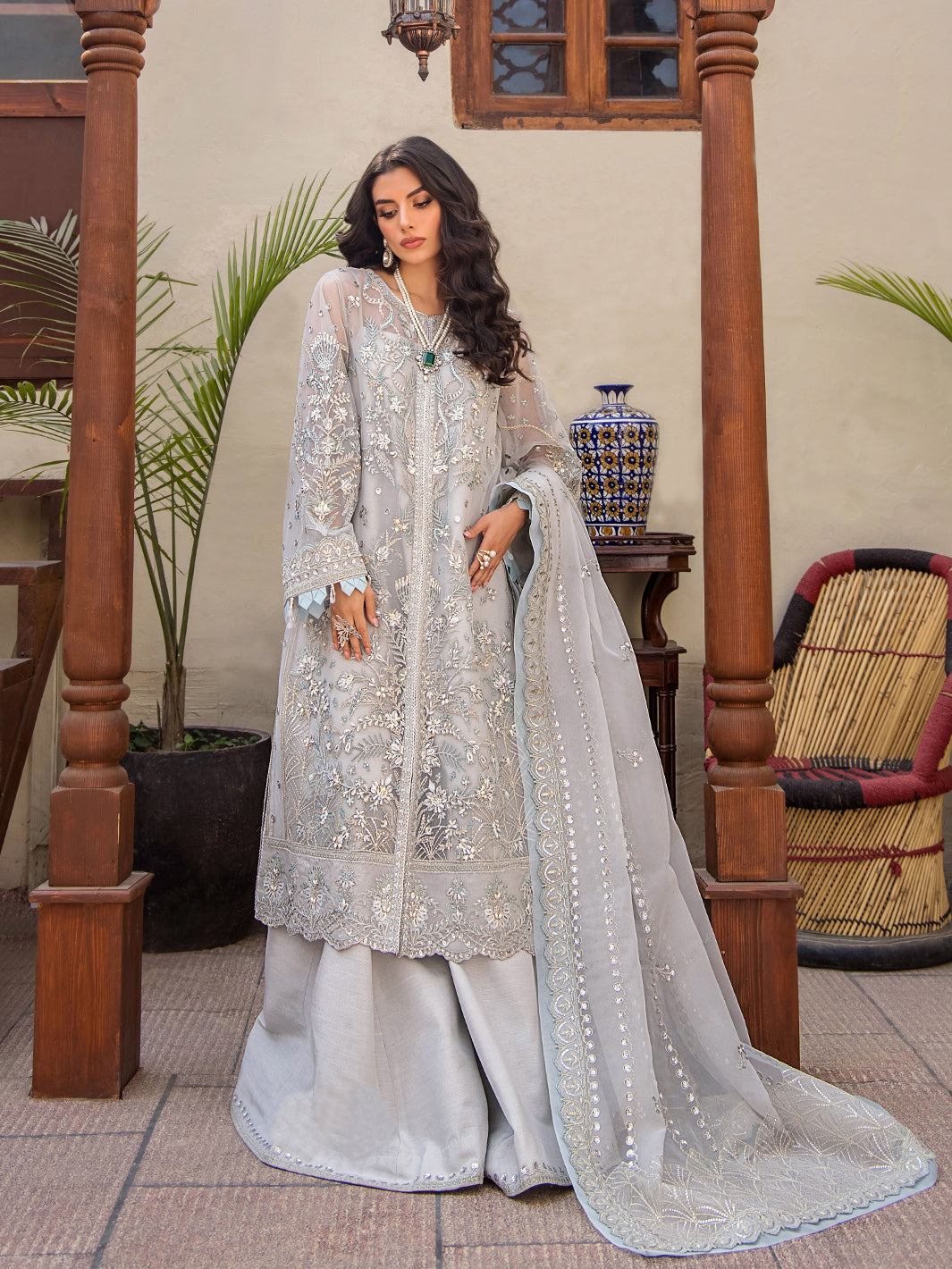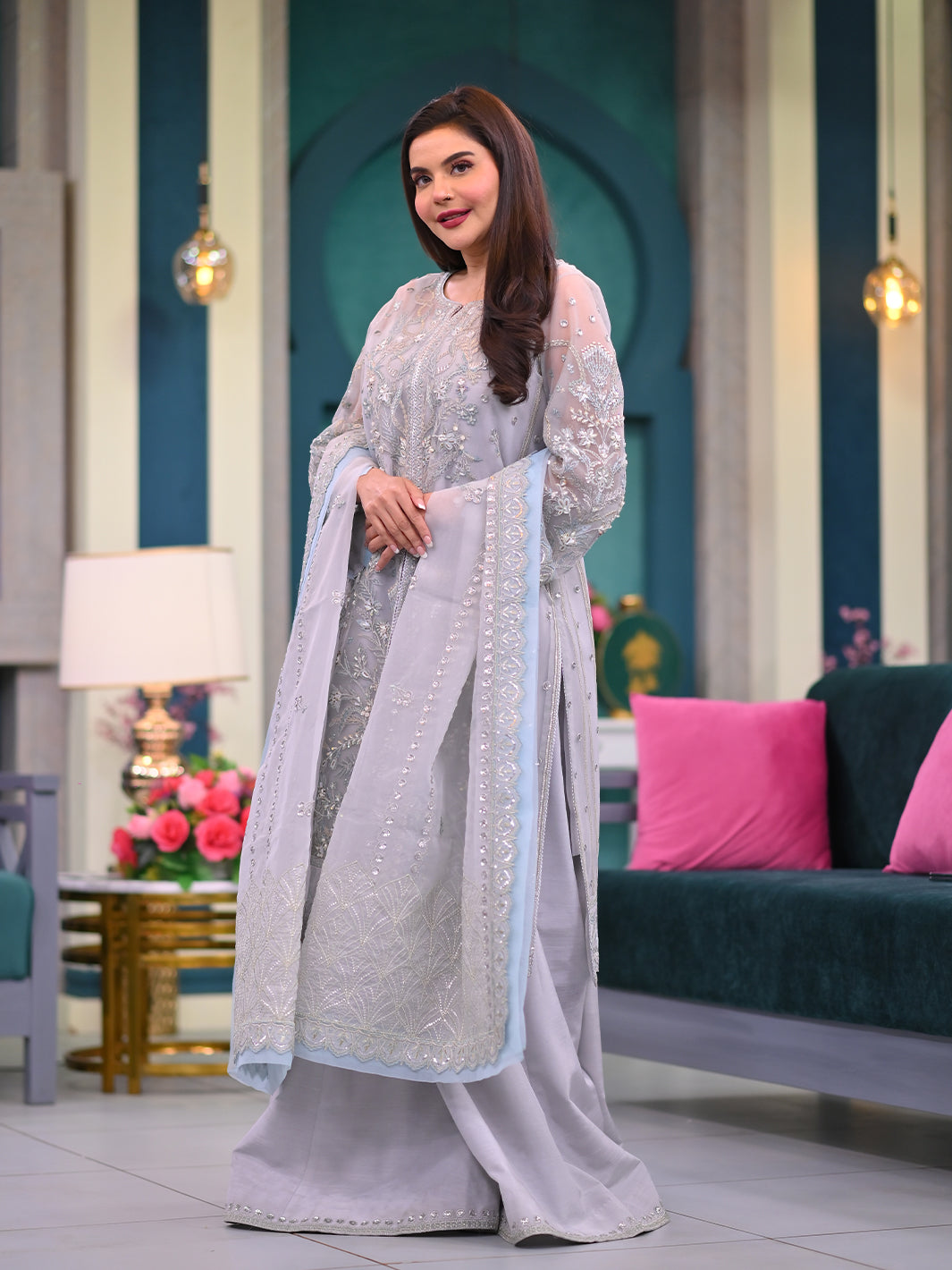 Inquire on Whatsapp Crafted on ethereal net base this exquisite ensemble in a dreamy grey color palette is curated with intricate threadwork and sequins enhanced with hand embellishment all over. Completing the look with embroidered organza dupatta, finished with scalloped embroidered borders with an additional layer blue organza. The silk sharara pants are also enriched with embroidered border, making it a marvelous look for any occasion this season.