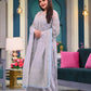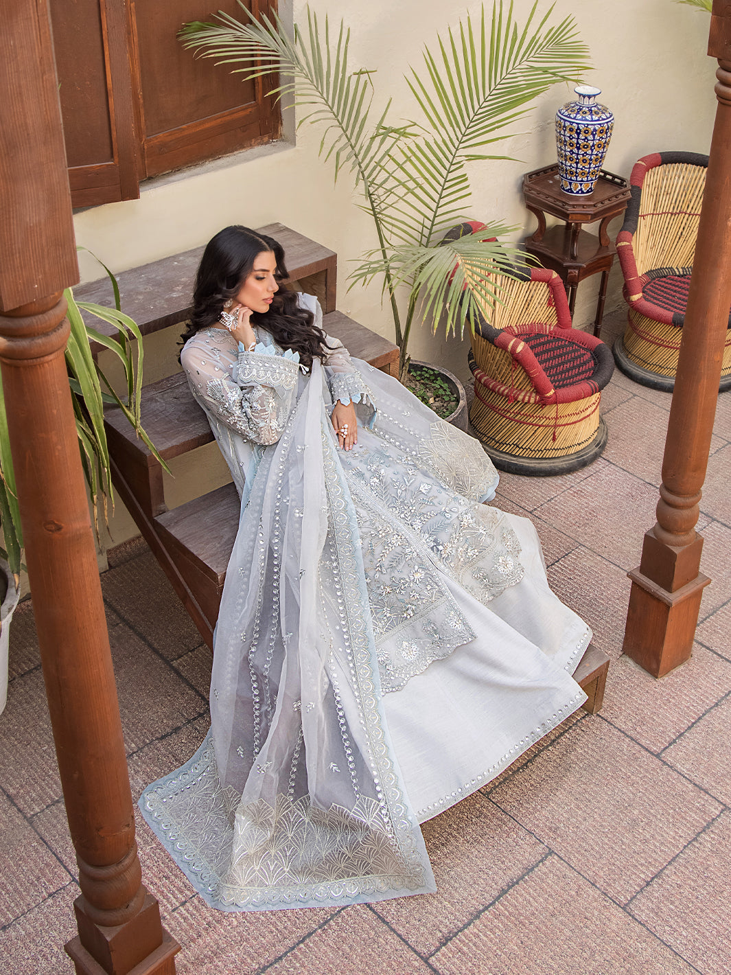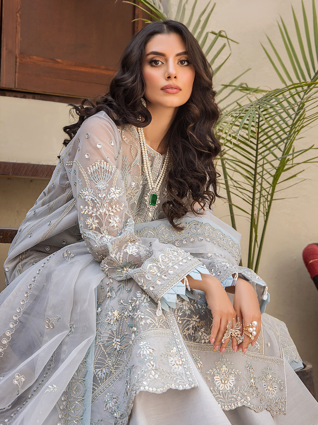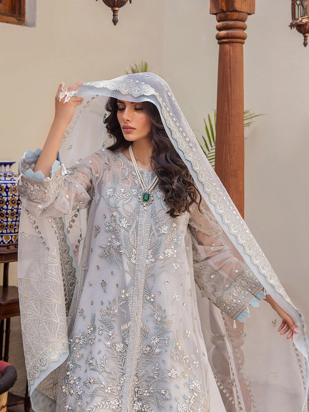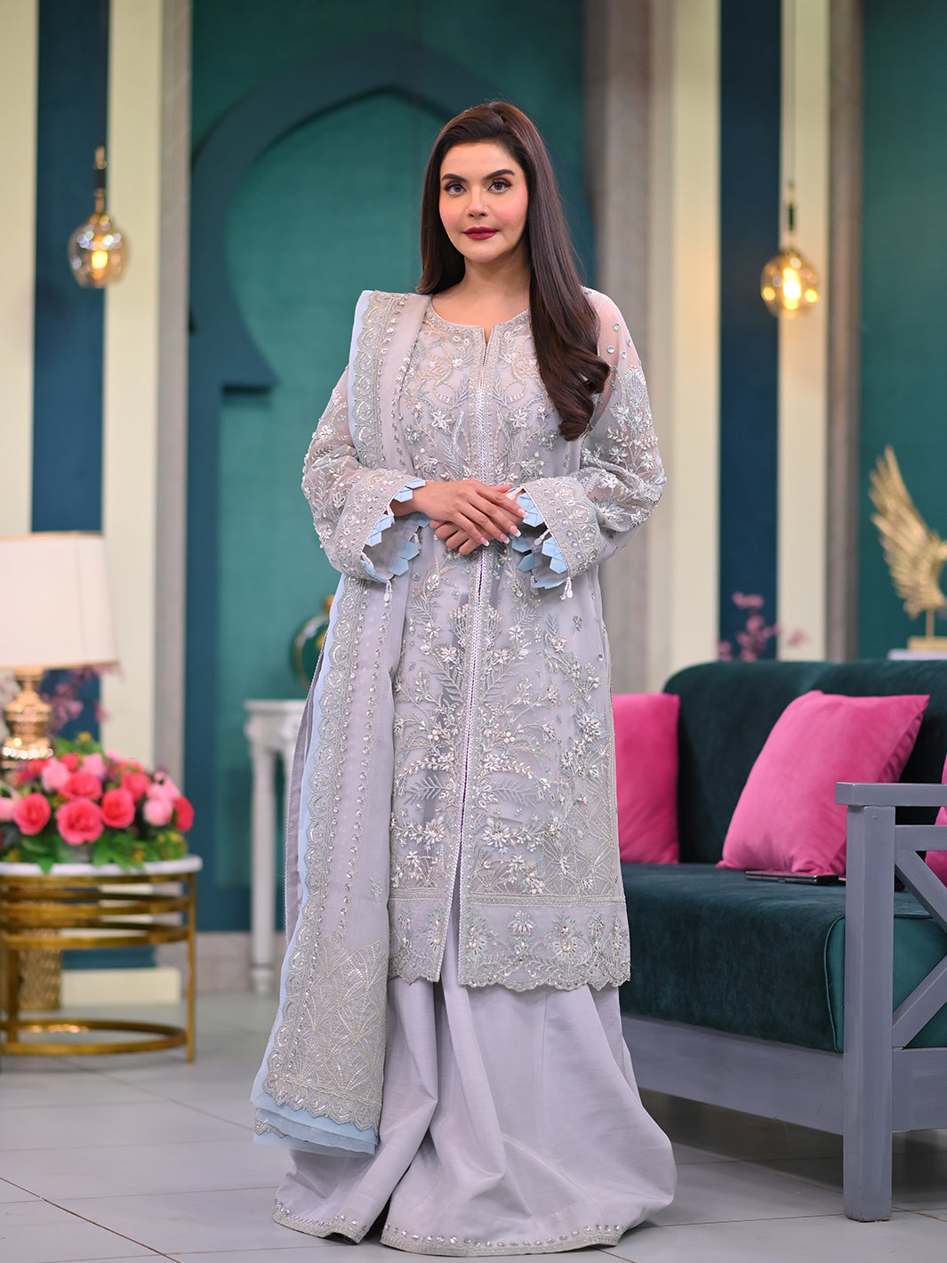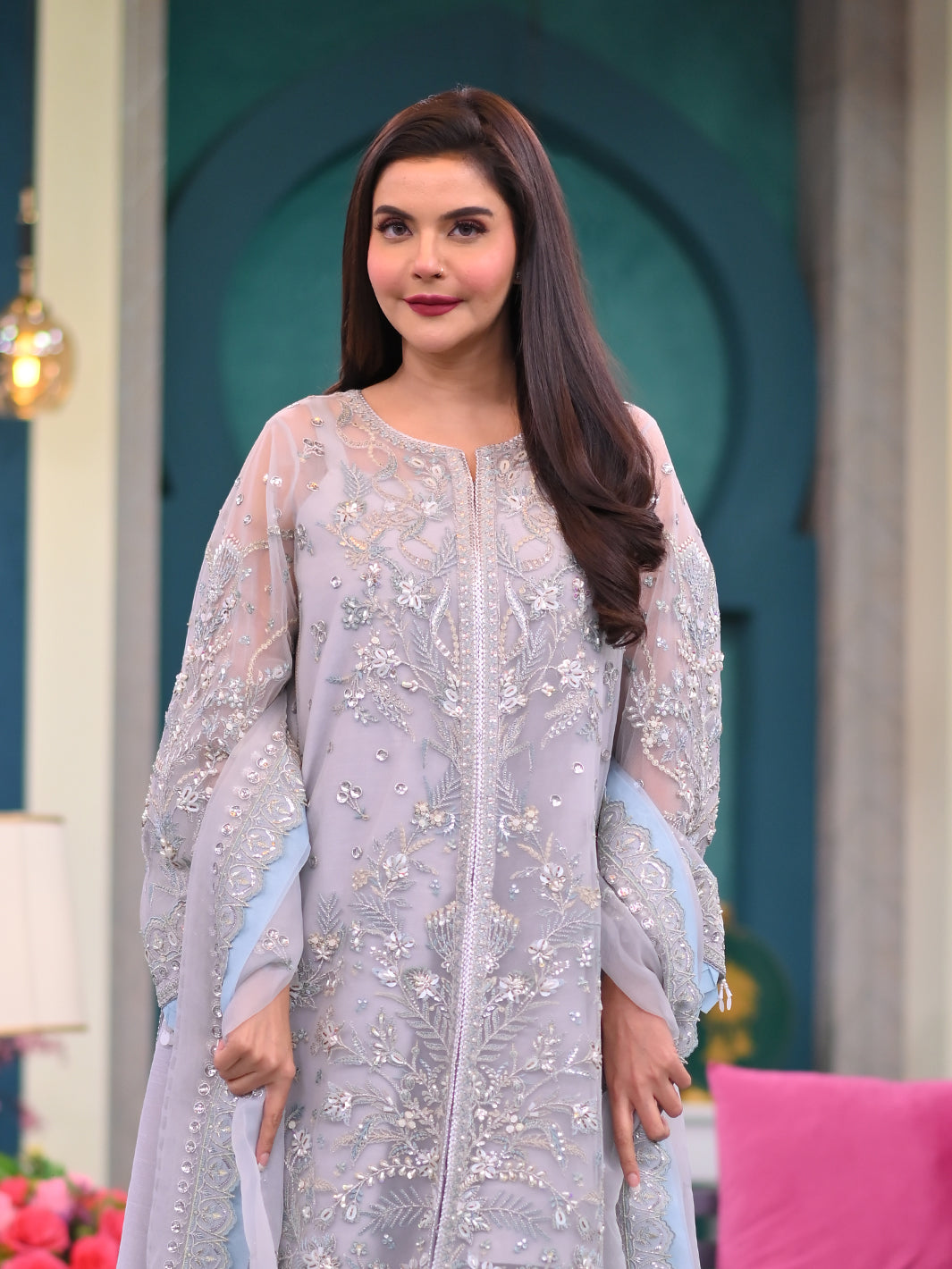 Inquire on Whatsapp Crafted on ethereal net base this exquisite ensemble in a dreamy grey color palette is curated with intricate threadwork and sequins enhanced with hand embellishment all over. Completing the look with embroidered organza dupatta, finished with scalloped embroidered borders with an additional layer blue organza. The silk sharara pants are also enriched with embroidered border, making it a marvelous look for any occasion this season.