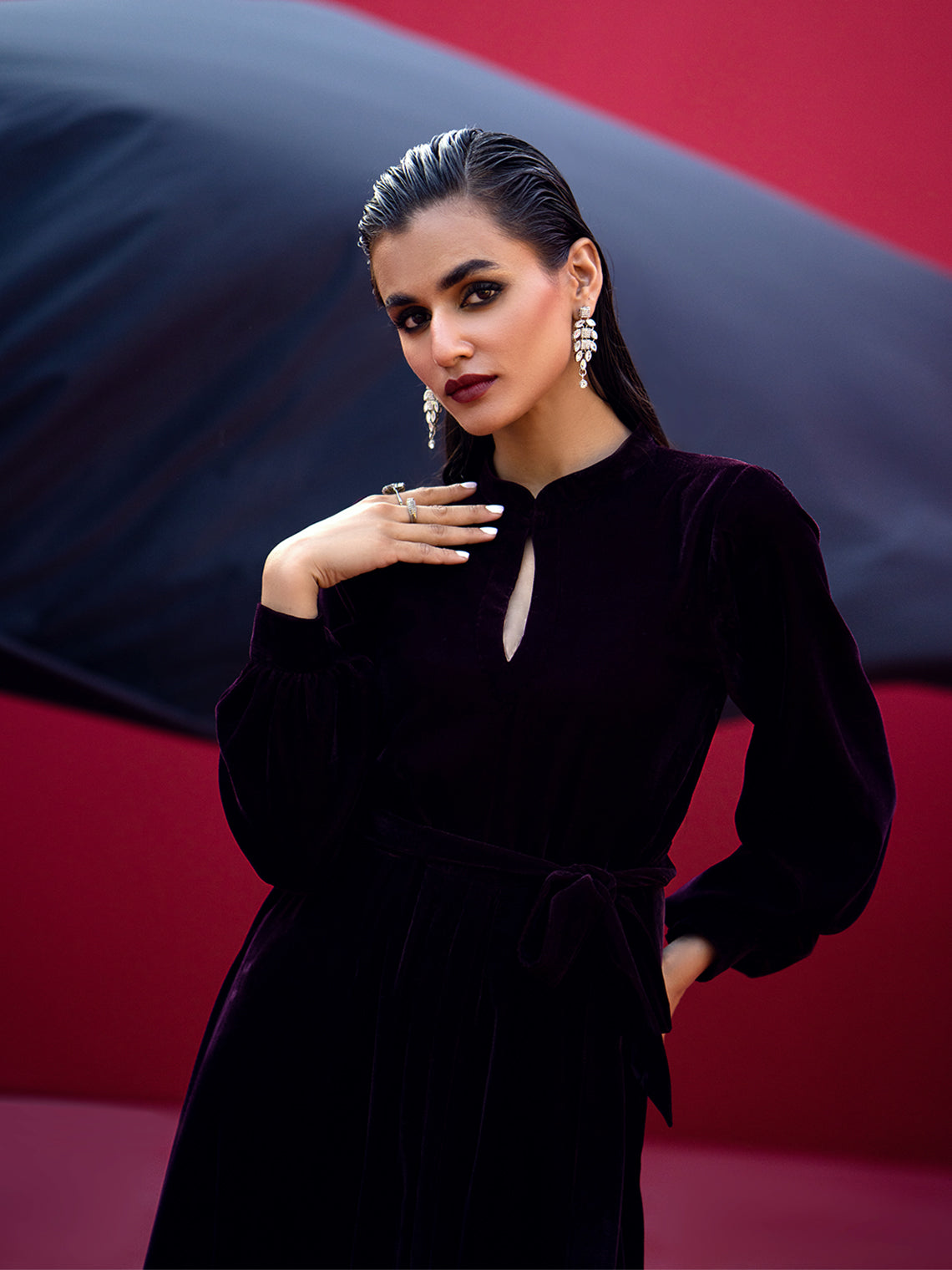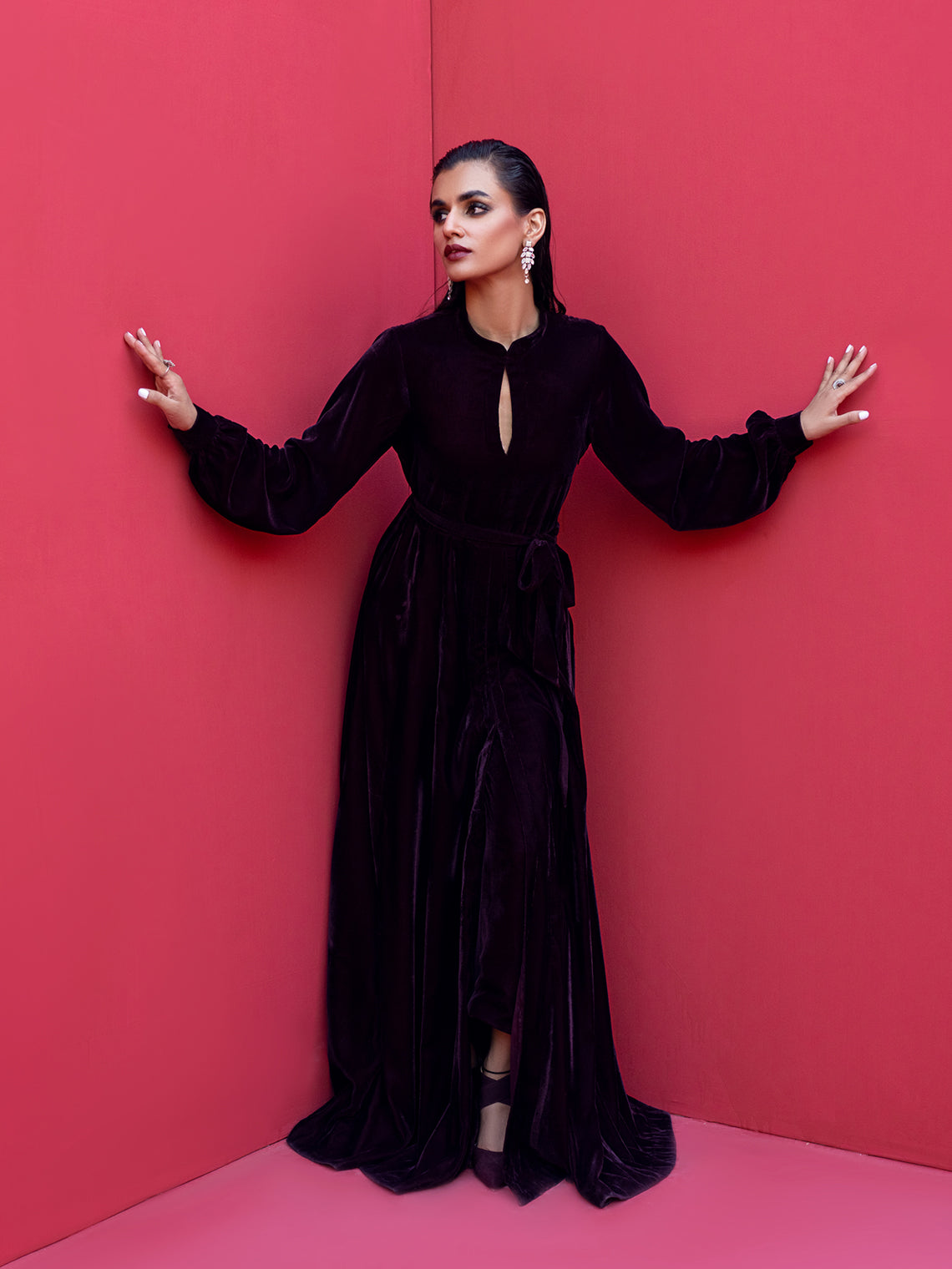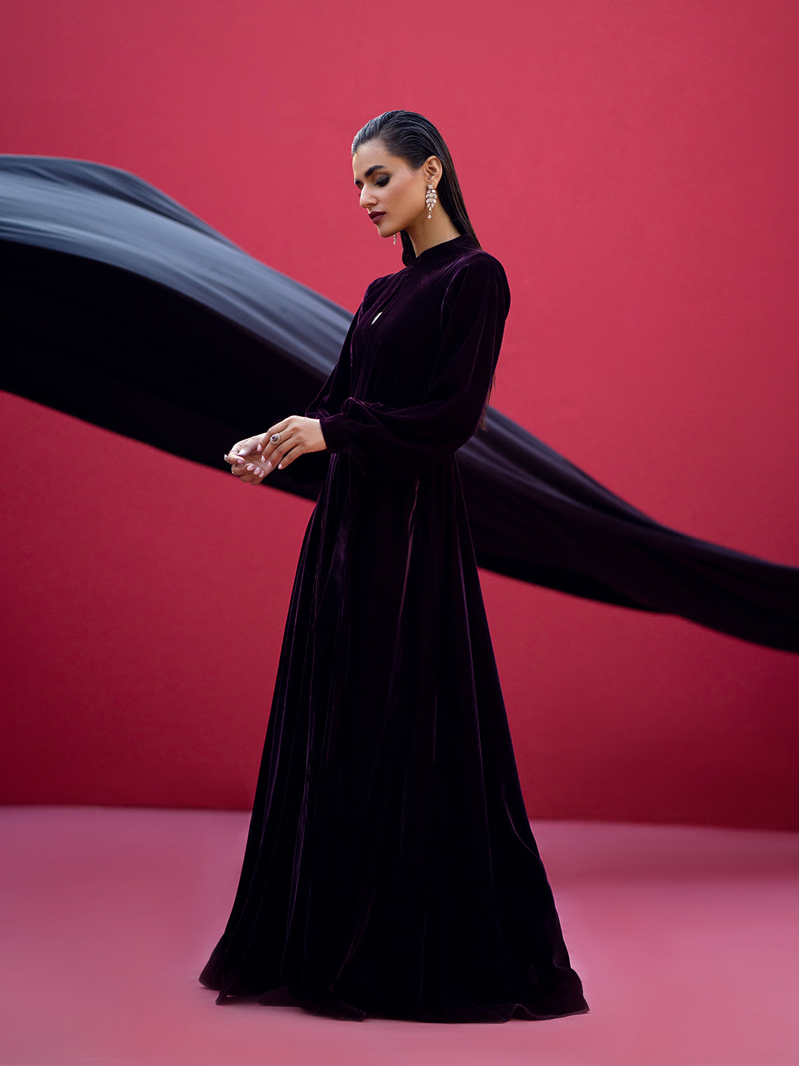 This stunning plum velvet maxi dress features a front open cut design, complete with a standing collar and curvy slit, creating a striking statement piece. The cuff sleeves add an element of refinement to the ensemble. To accentuate your figure, the maxi includes a functional velvet belt, enhancing the overall silhouette. Complementing the dress is a pair of velvet narrow trousers that effortlessly complete the look. Outfit : 2-Piece (Top& Bottom) Note: This outfit can be customized in terms of its colour & size. Delivery: 7 Days |