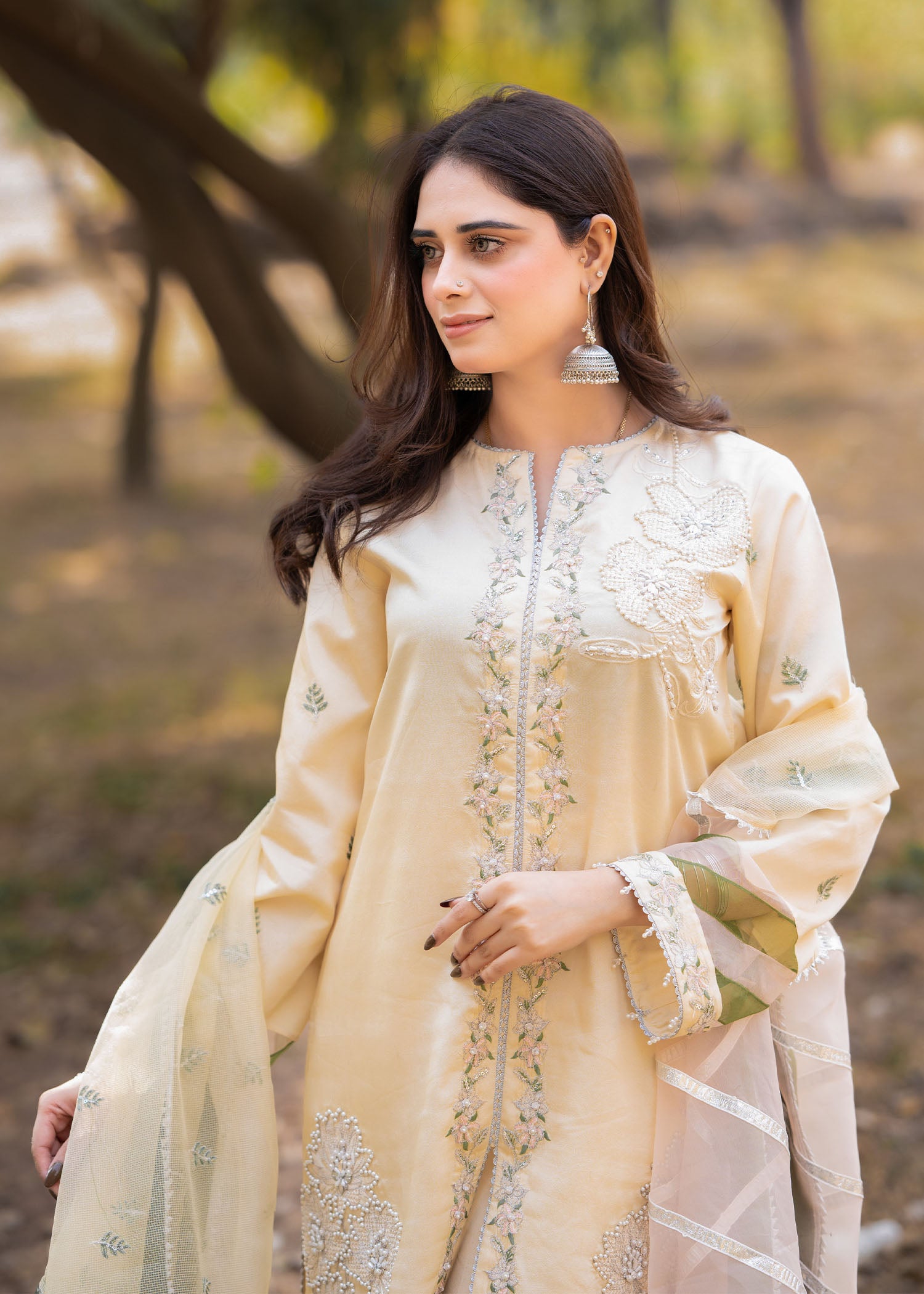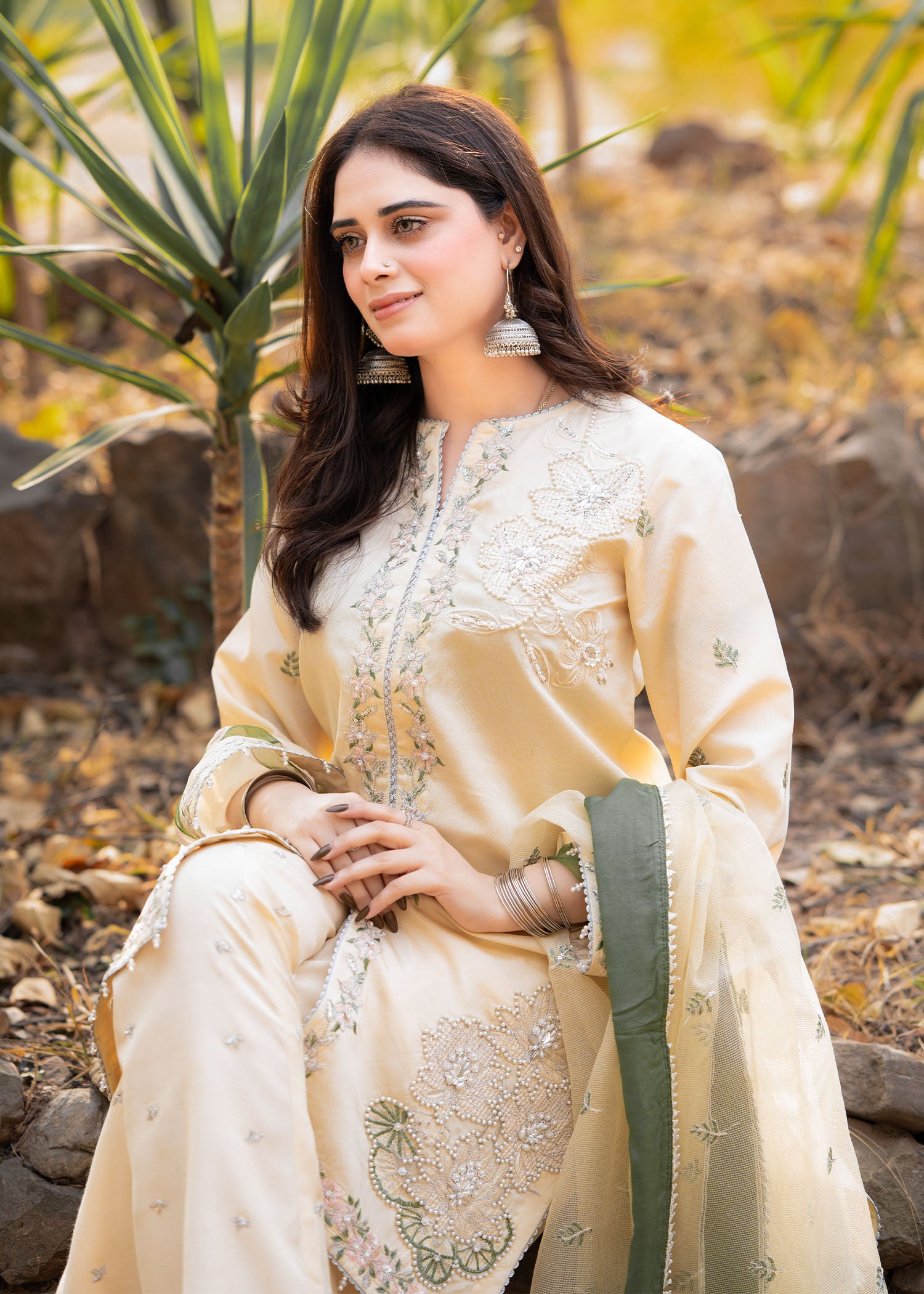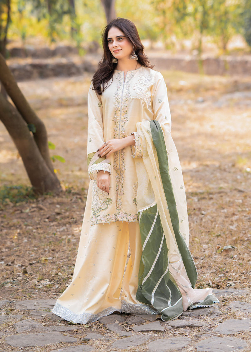 Make a statement this festive season with this stunning red and maroon tissue silk three-piece ensemble. Crafted for elegance, the luxurious tissue silk fabric drapes effortlessly, exuding grace and sophistication. Intricate detailing on shirt and crushed sharara enhances its festive charm, while the three tone organza dupatta adds a touch of timeless allure. Perfect for celebrations, this ensemble blends tradition with contemporary finesse, ensuring you shine with every step.