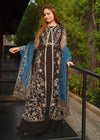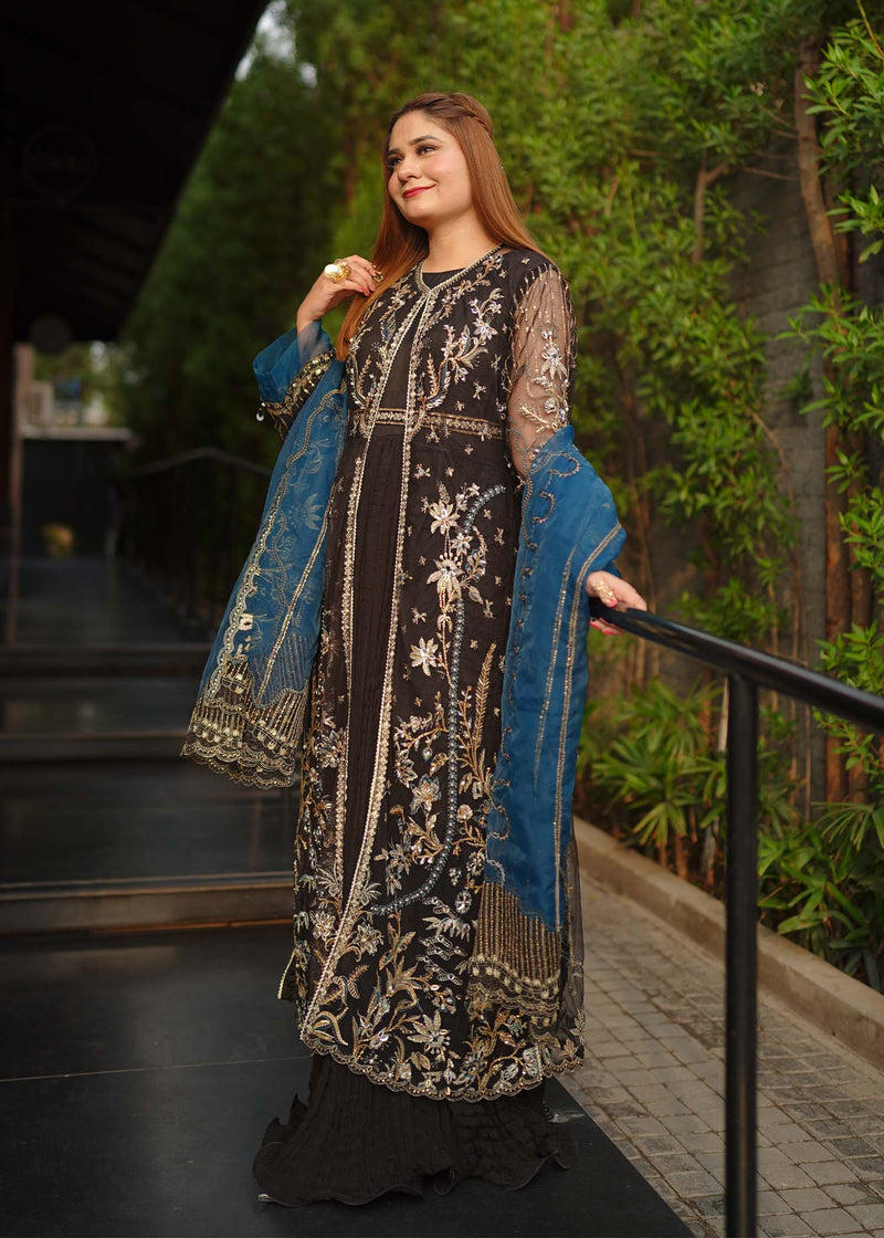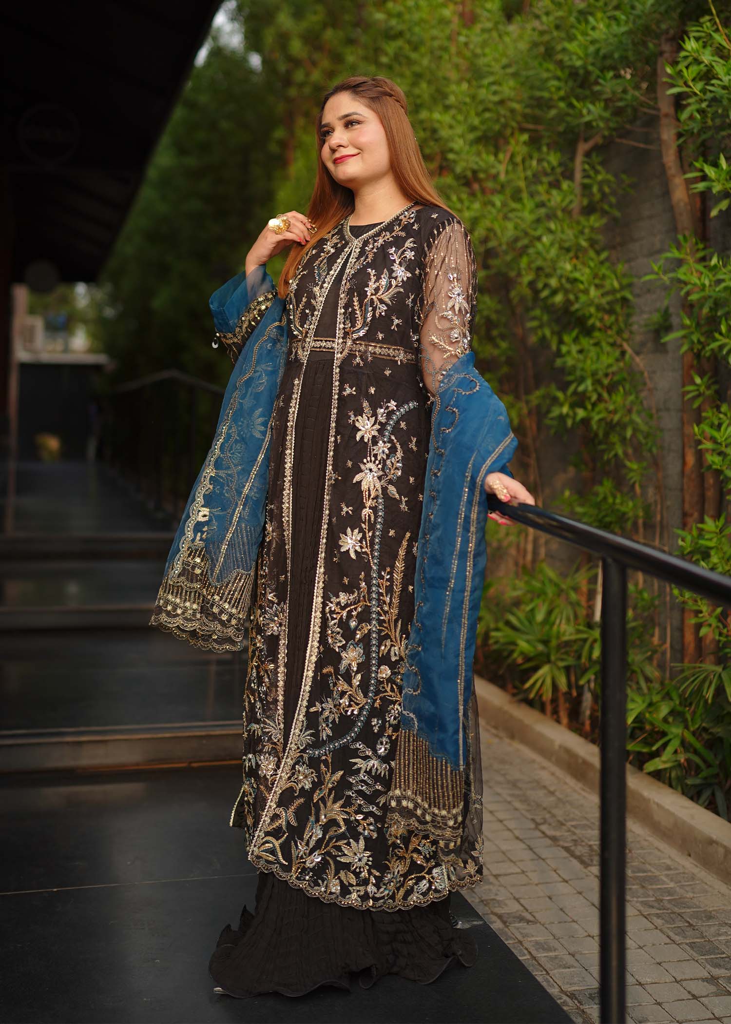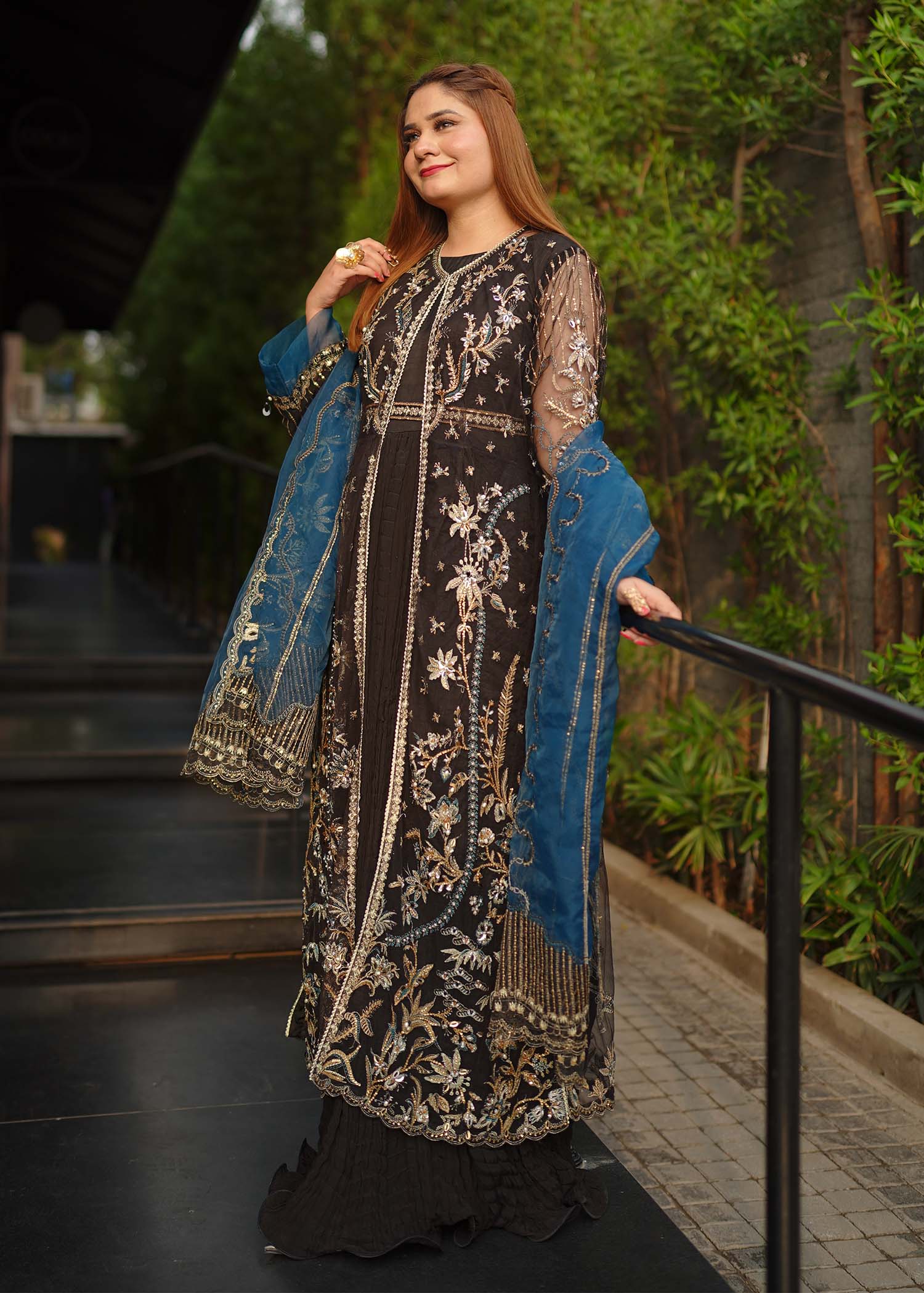 Inquire on Whatsapp Rendered in black; this exquisite ensemble is crafted with utmost precision to details. This alluring outfit features botanical embroideries accentuated with gold, silver and black hand embellishments artistically worked all over. Paired with crushed maxi and organza dupatta crafted on a surreal shade of teal blue which is framed with scalloped embroidered border. This outfit is a must have for all the soirees this season.
